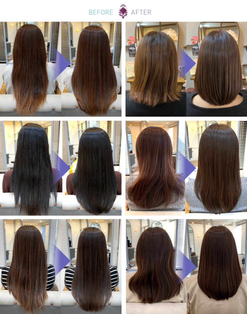 - カラーの前後で行う8工程のトリートメント施術でカラーダメージを予防し、毛先部分のダメージ進行をストップさせます。