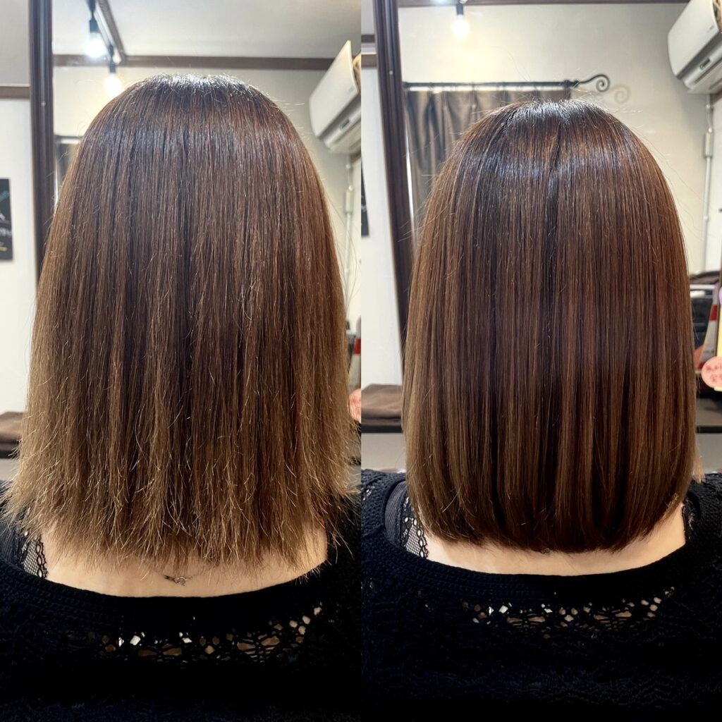 以前ブリーチをした毛先部分のパサつき、全体的な縮毛矯正のチリつきを綺麗に見せたいとのことでした。